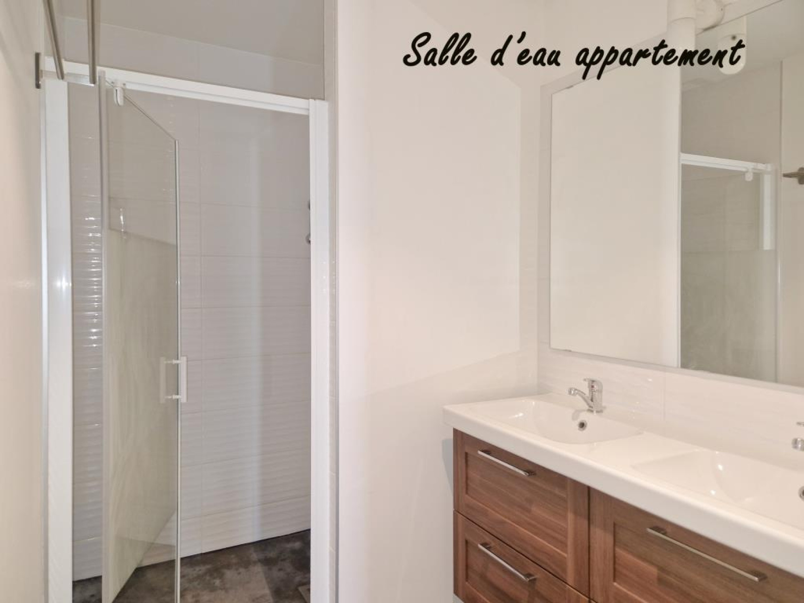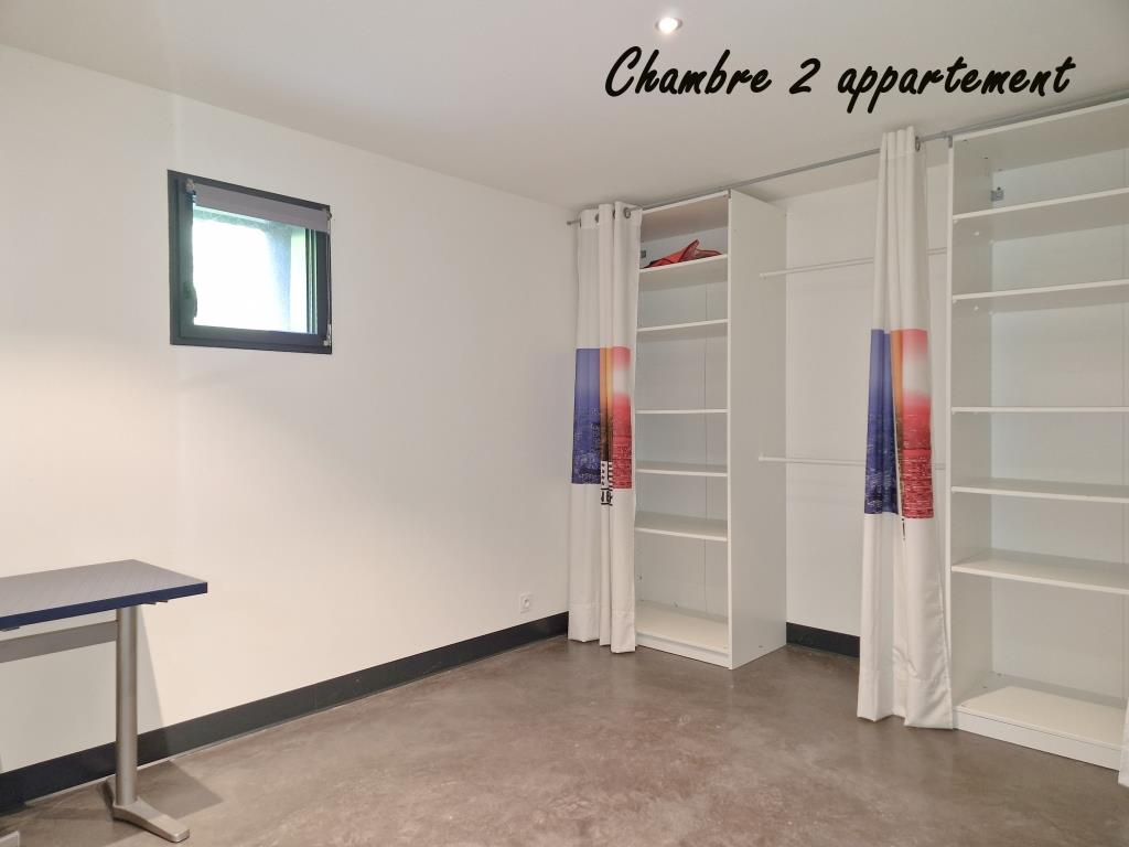 RDJ : appartement de type 3 offrant env. 60 m2 habitables avec cuisine équipée, entrée maison, garage double 60 m2 + local technique/buanderie.