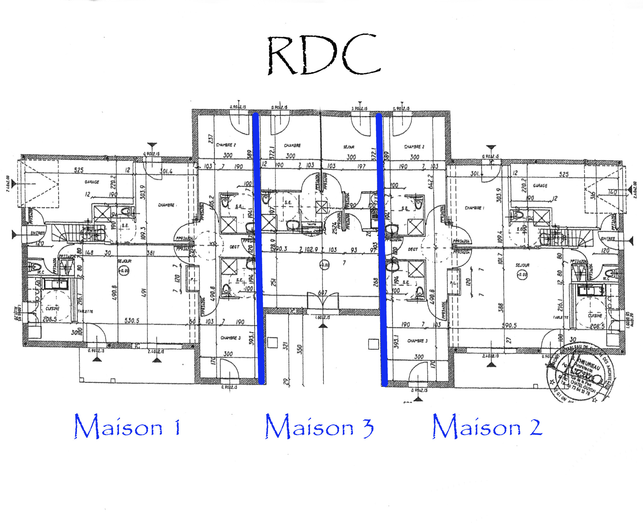 RDC : pièce de vie, 3 chambres avec chacune leur salle d'eau et wc, wc indépendant et garage