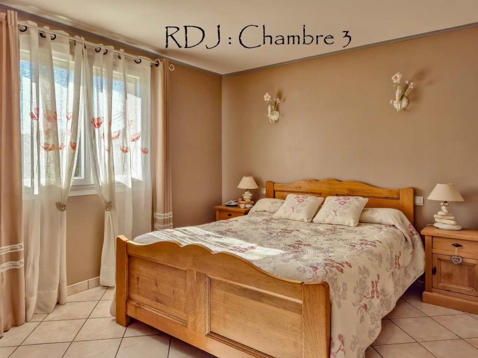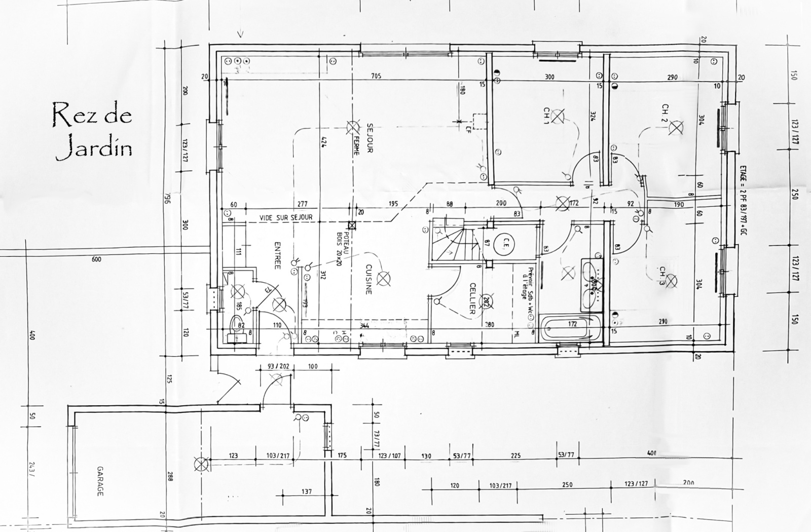 Rez de jardin : entrée, pièce de vie avec cuisine équipée, 3 chambres, un cellier, wc séparé, salle d'eau et couloir.