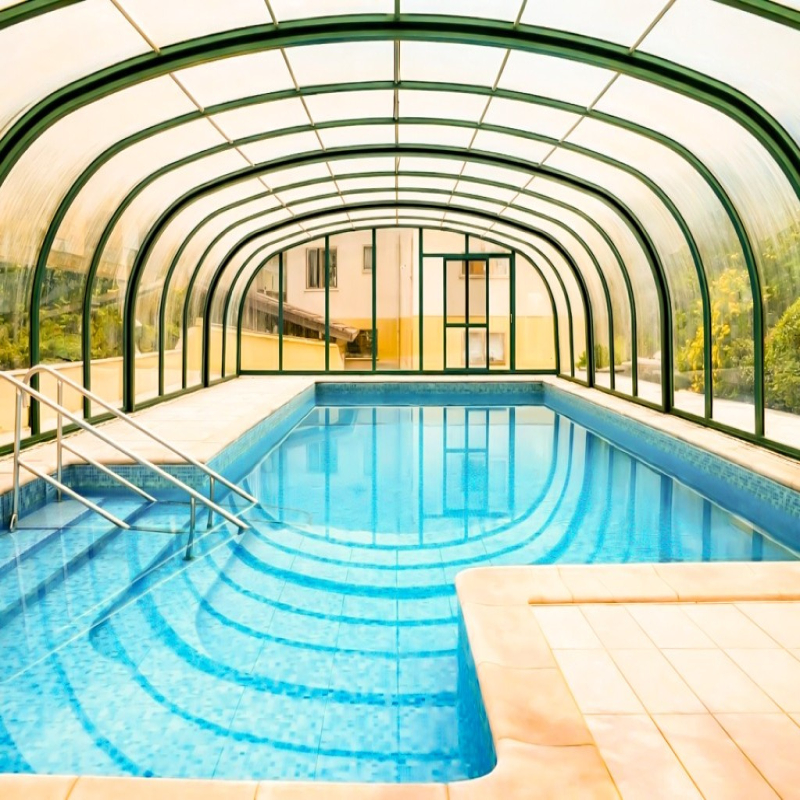 Piscine couverte 10 x 5.5 m chauffée avec nage à contre-courant, filtration automatique, traitement au sel.