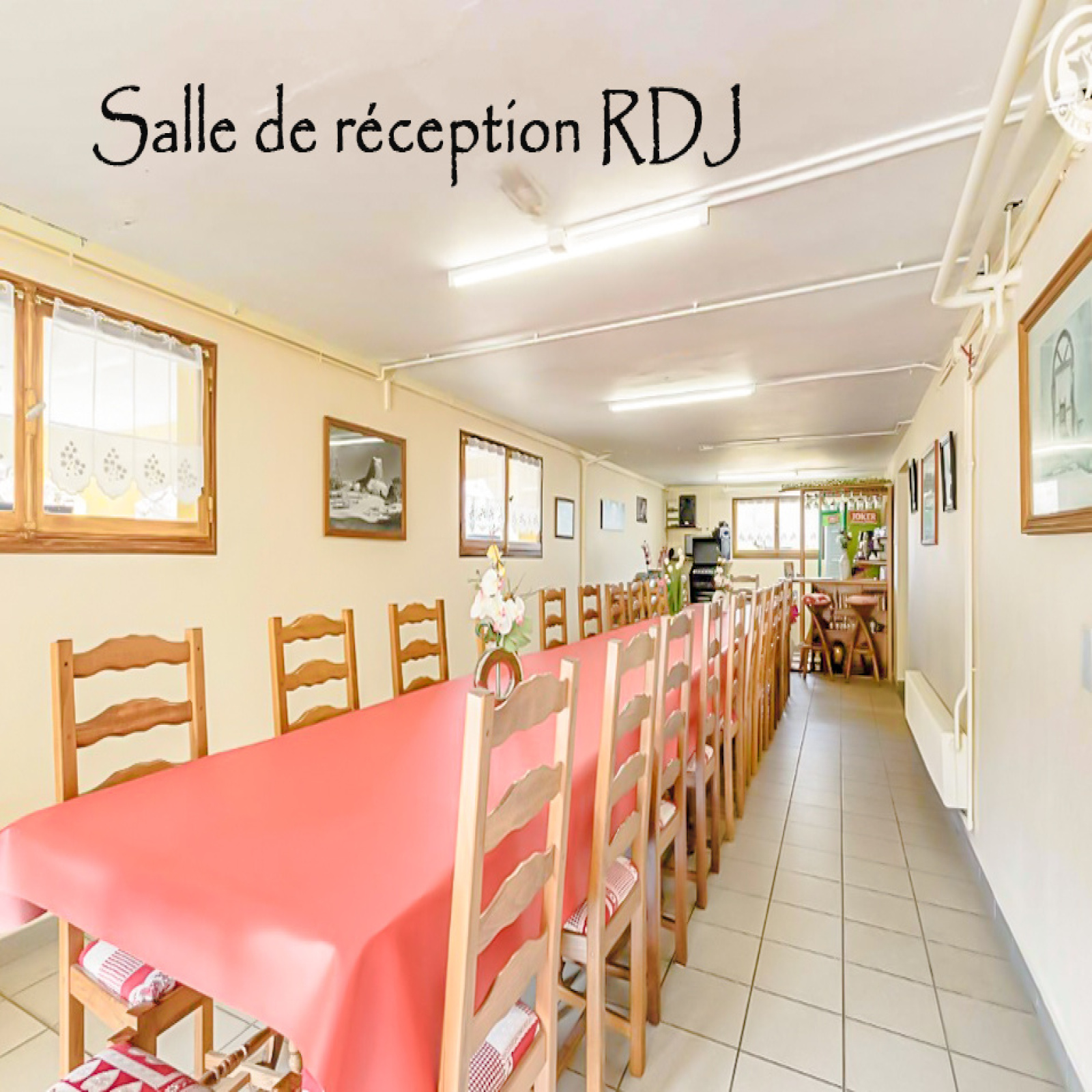 RDJ : entrée, pièce de réception, cuisine équipée, wc.