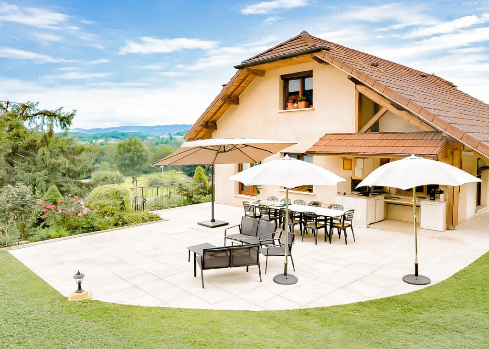 Parc de 3318 m2 clos et arboré avec une vue panoramique sur l'avant pays savoyard et la Dent-du-Chat et grand parking.