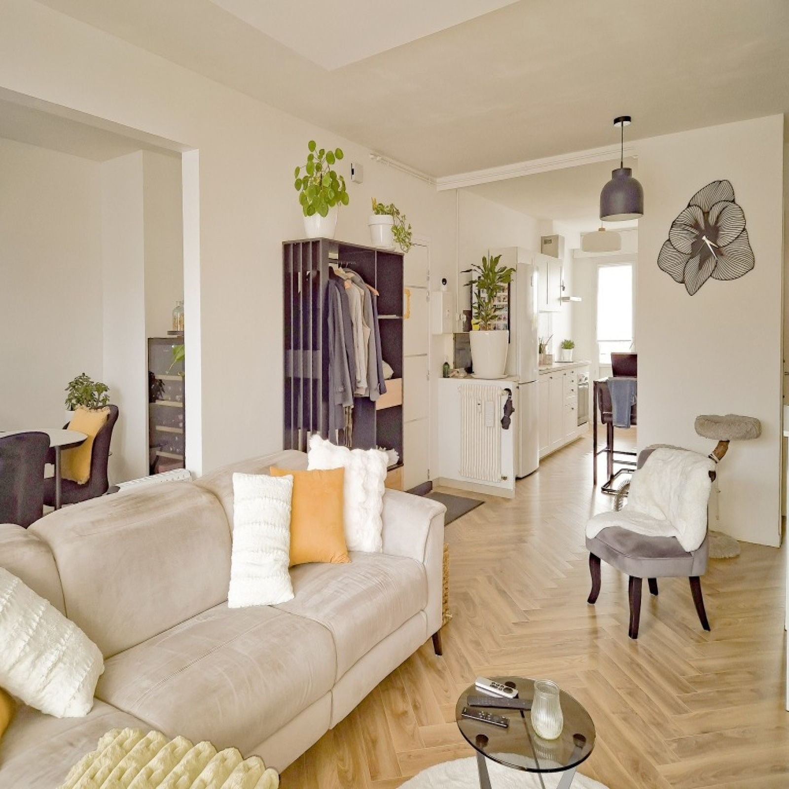 Belle pièce de vie de 47 m2 avec cuisine américaine équipée, 2 grandes chambres, un dressing, une salle d'eau et un wc séparé.