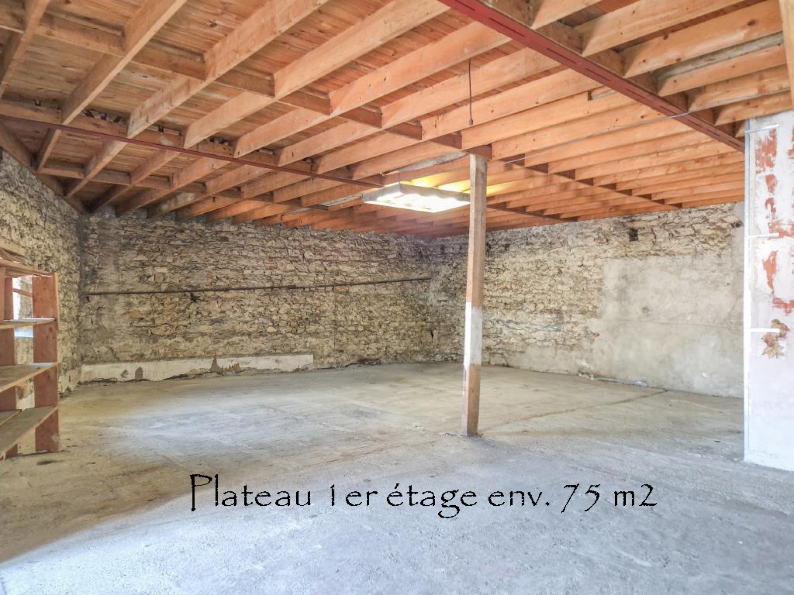 ETAGE : pièce de vie, cuisine séparée non équipée, 2 chambres, wc séparé, salle de bains, débarras + un grand plateau d'environ 75 m2 à aménager