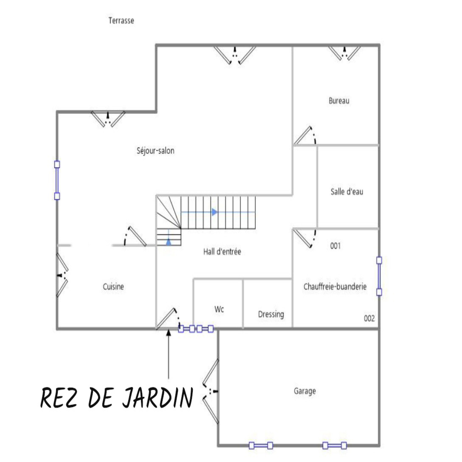 RDJ : entrée, cuisine équipée semi-ouverte, salon/séjour, dressing, buanderie, chambre, salle d'eau, wc et dégagement.