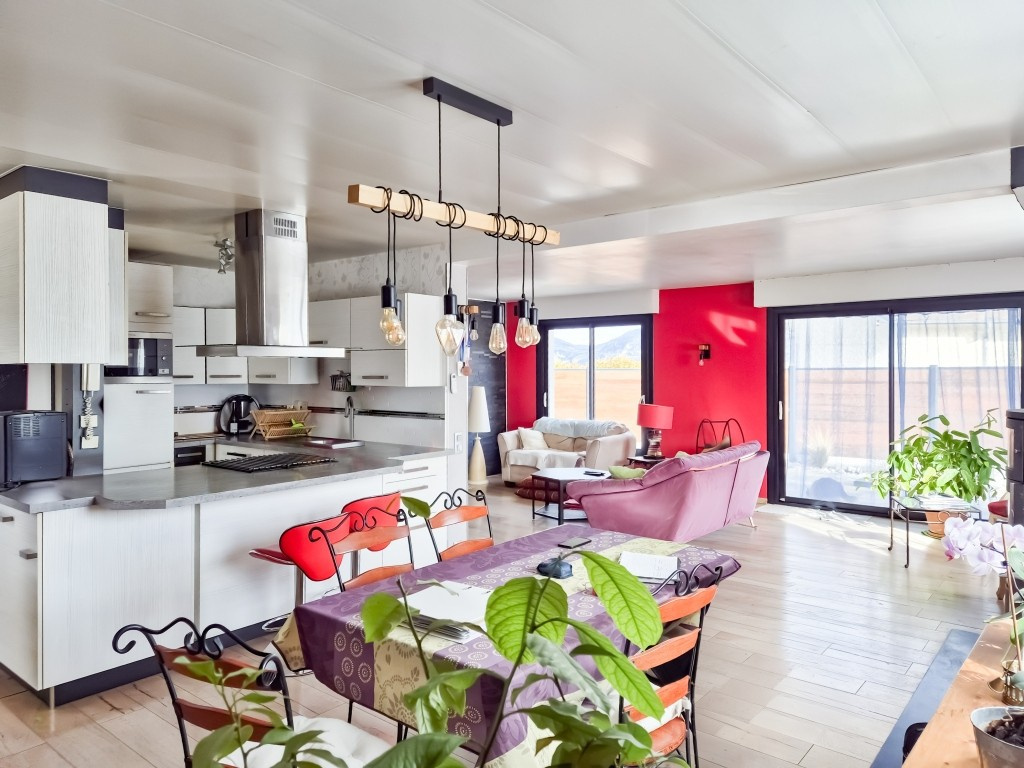 Chauffage par PAC réversible (2022) + poêle à bois (2021), menuiseries double vitrages PVC, volets, porte de garage et portail motorisés, isolation par les murs et par le toit.
